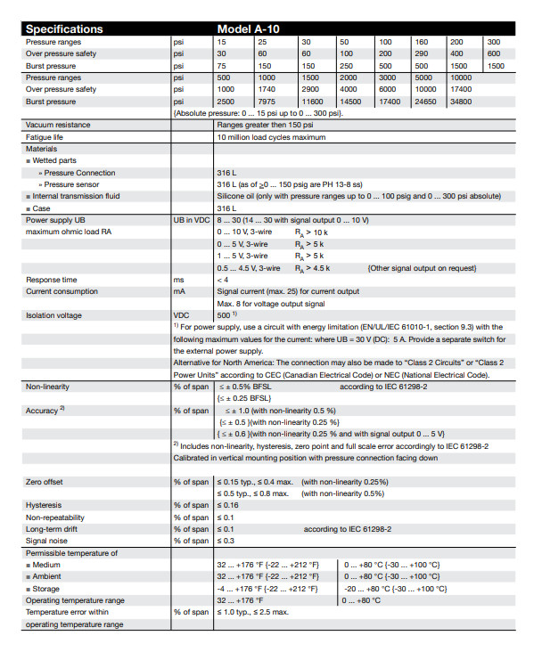 विनिर्देश वैकल्पिक रूप से मॉडल A-10 एक बेहतर गैर-रैखिकता के साथ उपलब्ध है। चयनित गैर-रैखिकता के आधार पर निम्नलिखित मान परिणामः सटीकता विनिर्देश गैर-रैखिकता ≤ ± 0स्पैन का 5 प्रतिशत गैर-रैखिकता ≤ ±0.25 % span BFSL प्रति IEC 61298-2 गैर-रैखिकता माप सीमा ≤ 0.1 bar [≤ 1.45 psi] ≤ ±0.5 % span - माप सीमा > 0.1 bar [> 1.45 psi] ≤ ±0.5 % span ≤ ±0.स्पैन का 25 प्रतिशत 1) सटीकता → देखें अधिकतमIEC 61298-2 के अनुसार मापी गई त्रुटि अधिकतम मापी गई त्रुटि IEC 61298-2 के अनुसार मापने की सीमा ≥ 0.6 बार [≥ 8.7 पीएसआई] ≤ ±1 प्रतिशत स्पैन ≤ ±0.5 प्रतिशत स्पैन मापने की सीमा ≥ 0.4 बार [≥ 5.8 पीएसआई] ≤ ±1.2 प्रतिशत स्पैन ≤ ±0.7 प्रतिशत स्पैन माप सीमा ≥ 0.25 बार [≥ 3.6 पीएसआई] ≤ ±1.3 प्रतिशत स्पैन ≤ ±0.8 प्रतिशत स्पैन माप सीमा ≥ 0.16 बार [≥ 2.3 पीएसआई] ≤ ±1.5 प्रतिशत स्पैन ≤ ±1 प्रतिशत स्पैन माप सीमा ≥ 0.1 बार [≥ 1.45 पीएसआई] ≤ ±1.8 प्रतिशत स्पैन - माप सीमा ≥ 0.05 बार [≥ 0.73 पीएसआई] ≤ ±2.4 प्रतिशत स्पैन - शून्य बिंदु त्रुटि 2) 3) 4... 20 एमए / डीसी 1... 5 वी / डीसी 0.5... 4.5 वी / डीसी 0.5... 4.5 वी रैशियोमेट्रिक ≤ ±0.3 प्रतिशत स्पैन ≤ ±0.DC 0 के 2 %... 10 V ≤ ±0.5 % span ≤ ±0.4 % span DC 0... 5 V 4) ≤ ±0.6 % span - 1) आउटपुट सिग्नल DC 0... 5 V के साथ संभव नहीं है 2) माप सीमा ≤ 0.1 bar [≤ 1.]45 psi] (या समकक्ष) केवल ≤ ±0 के साथ संभव है.5 % span. 3) reference conditions के बाहर, measuring ranges < 0.6 bar [< 8.7 psi] के लिए temperature hysteresis जोड़ें। 4) measuring ranges ≤ 0.1 bar [≤ 1.45 psi] (या समकक्ष) के साथ संभव नहीं है।इलेक्ट्रोस्टैटिक डिस्चार्ज के कारण कभी-कभी खराबी होने पर, एक अस्थायी अतिरिक्त माप त्रुटि ± 2.5 प्रतिशत तक हो सकती है।![]()